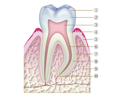 | ⑩根袋孔 | 歯根の先端にある孔から神経や血管がでています。歯の内部に栄養を補給しています。 |