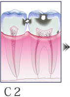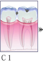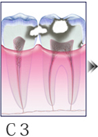 | 処置:削らないで虫歯予防の樹脂材料をつめるだけで終わります。 | 処置:削って白い詰め物をします。 | 処置:神経の処置が必要です。麻酔後、神経を取り、腐った神経膿を取ります。数回洗浄、消毒後、綺麗になってから神経が入っていた穴に薬を詰めます。金属の土台を入れ、歯全体をすっぼり被せます。 | 処置:技齒 |