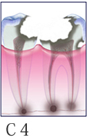 | 健康な歯の抗態です | 虫歯の初期症状。歯の表面だけ溶け始めた状態です。痛みはありません。 | 歯の表面(エナメル質)でなくその下の歯の部分(象牙質)まで溶けはじめてきた状態です。冷たいものがしみたり甘いもので痛みを感じたりします。 | 虫歯が神経まで達した状態です。皆さんが歯が痛くて歯医者に行く場合はこの状態が多いです。ズキズキと痛んだり、食事時にかんでいても痛んだりします。 | 虫歯の末期症状です。歯が歯の根だけ残った状態です。強く痛んだり歯ぐきが化膿して腫れたりします。放置しておくと顎の骨も腐って溶けたりします。 |